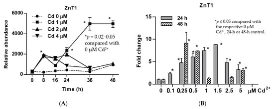 Expression levels of ZIP and ZnT zinc transporters by UROtsa cells 24 h after exposure to 0, 1, 2, and 4 µM Cd concentrations are shown in Table 1. The expression level as number of transcripts of each individual zinc transporter gene was relative to 1000 or 10,000 β-actin gene transcripts.