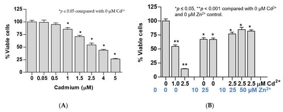 Exposure to 0.05 and 0.5 µM concentrations of Cd for 24 h did not reduce cell viability, while exposure to 1, 1.5, 2.5, 4, and 5 µM of Cd for 24 h decreased cell viability by 15%, 29%, 57%, 66%, and 74%, respectively (Figure 2A). Thus, 2.5 µM Cd was considered to be a 50% lethal dose (LD50) of Cd in UROtsa cells. Exposure to Cd at the LD50 level (2.5 µM) for 48 h together with Zn at 10, 25, and 50 µM concentrations prevented loss of cell viability caused by Cd. This was evident from the viability of 80% among those with concurrent Zn exposure as compared with 14% of those exposed to Cd alone with equivalent Cd molar concentrations (Figure 2B).