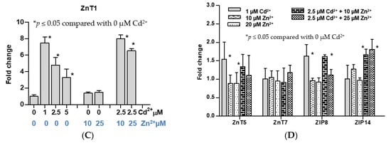 Of note, an average cell viability of 80% among cells exposed to both 2.5 µM Cd2+ and 10, 25, or 50 µM Zn was the same as those exposed only to 1 µM Cd for 24 h (Figure 2B). Intriguingly, exposure to 2.5 µM Cd concurrent with 10 or 25 µM Zn increased ZnT1 expression by the same extent as exposure to 1 µM Cd alone (Figure 2C). Expression levels of ZnT1, ZnT5, ZnT7, ZIP8, and ZIP14 genes were not affected by exposure to Zn at 10 or 25 µM Zn. Simultaneous exposure to 10 µM Zn and 2.5 µM Cd increased expression levels of ZnT5, ZIP8,and ZIP14 genes by the same extent as exposure to 1 µM Cd alone (Figure 2D).