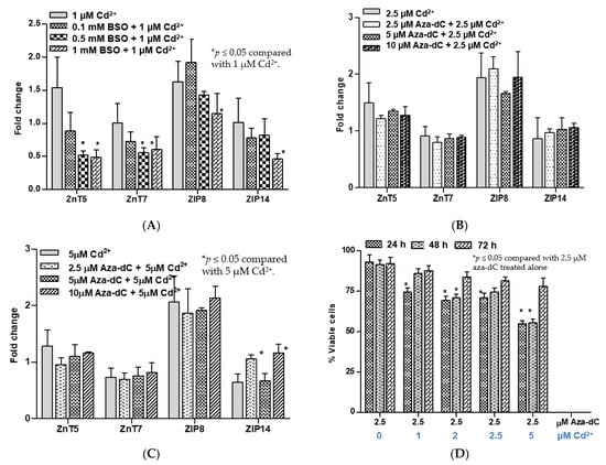 Effects of cadmium on expression of selected zinc transporters and viability of BSO- and aza-dC-treated cells. (A) Changes in expression levels of ZnT5, ZnT7, ZIP8, and ZIP14 in BSO-treated cells caused by 1 µM Cd2+; (B) changes in expression levels of ZnT5, ZnT7, ZIP8, and ZIP14 in aza-dC-treated cells caused by 2.5 µM Cd2+; (C) changes in expression levels of ZnT5, ZnT7, ZIP8, and ZIP14 in aza-dC-treated cells caused by 5 µM Cd2+. Effects of 24, 48, and 72 h of cadmium exposure on viability of UROTsa cells pretreated with 2.5 µM aza-dC (D). Fold change or a ratio was defined as number of transcripts of a given gene relative to β-actin in control cells divided by number of transcripts of the same gene in treated cells relative to β-actin. Expression profiles in (A) were based on RNA samples from cells in Figure 3B. Expression profiles in (B,C) were based on RNA samples from cells in Figure 3D. An effect of aza-dC treatment duration in (D) was assessed with a different batch of cells.
