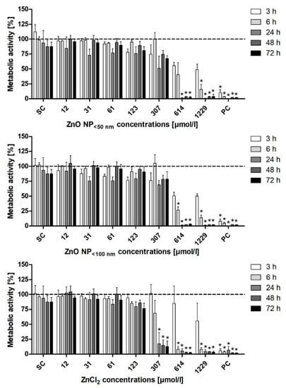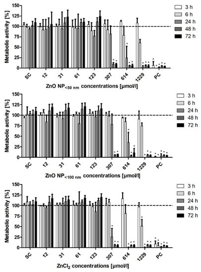 | ZnO NP<50 nm | 0 | 148 ± 12 | 137 ± 37 | 30 ± 8 | 22 ± 3 |