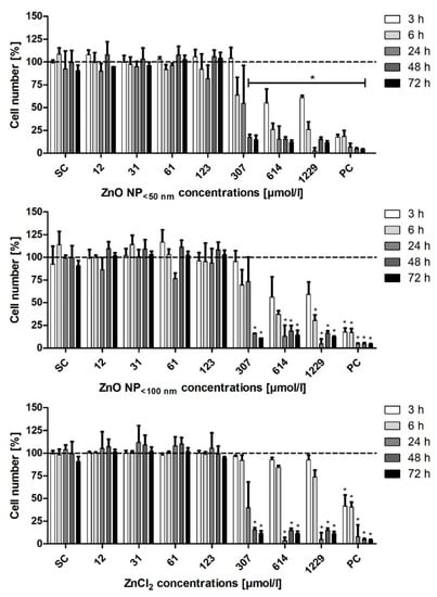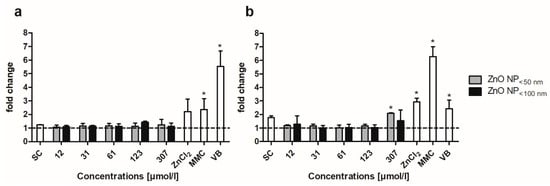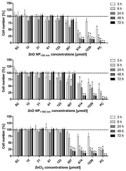 - Moratin, H.; Scherzad, A.; Gehrke, T.; Ickrath, P.; Radeloff, K.; Kleinsasser, N.; Hackenberg, S. Toxicological characterization of ZnO nanoparticles in malignant and non-malignant cells. Environ. Mol. Mutagen. 2018, 59, 247–259. [Google Scholar] [CrossRef] [PubMed]