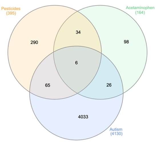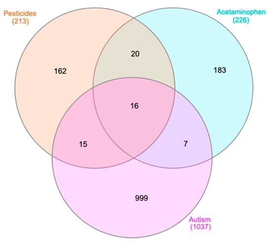 The PubChem, DrugBank, CTD, Open Targets, and IPA databases were searched with keywords such as “Acetaminophen”, “Tylenol”, and “APAP” to identify genes in the human genome associated with APAP. Each database then matched the search term to existing concepts before executing the search. The search term “Tylenol”, for example, yielded results related to terms such as “Paracetamol”. For identifying genes associated with pesticides, the Chemicals and Diseases tabs were selected in independent searches of the term “Pesticides” using CTD. Each independent search of CTD employed different combinations of disease category, set to either Autism Disorder or Nervous System disease, and association type, set to curated or inferred. Finally, independent searches of the six molecular databases (Clinvar, PheGenI, MetaCore, IPA, Open Targets, and CTD) were performed to identify genes related to ASD using the search terms “Autism”, “Autism Spectrum Disorder”, or “Autism or Intellectual Disability” and find genes associated with ASD. The lists of genes generated by these searches were sorted into their respective categories (APAP, pesticides, ASD) and used to create Venn diagrams using InteractiVenn (http://www.interactivenn.net/, accessed in May 2020), which revealed overlapping genes between lists. The genes in each category that were identified in at least two databases, or the same database but with two independent search criteria, were used for further analysis.