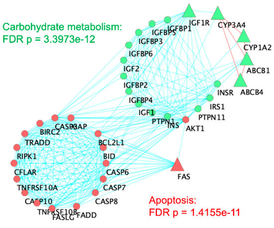 The interaction network in Figure 2 shows the six genes from the master Venn diagram represented as large triangles and interacting genes from the STRING database as circles. Red nodes relate to apoptosis, or programmed cell death (FDR p = 1.41 × 10−11). Green nodes comprise a cluster that is significantly related to carbohydrate metabolism (FDR p = 3.39 × 10−12).