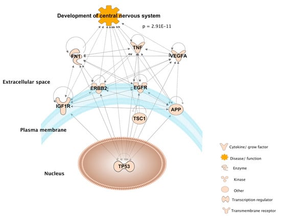 Ingenuity Pathway Analysis diagram connecting 9 out of the 22 overlapping genes from the molecular database and literature mining, as they are significantly associated with the development of the central nervous system according to Fisher’s Exact test (p = 2.91 × 10−11) in the IPA knowledgebase.