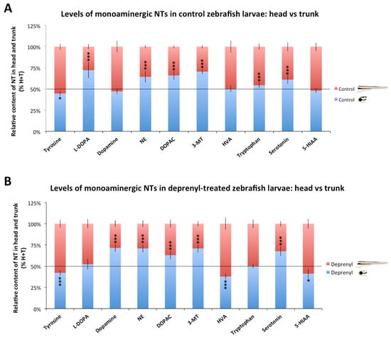 Levels of monoaminergic neurochemicals in the head and trunk of zebrafish larvae. (A) Distribution in the head and the trunk of control larvae 8 days post-fertilization (dpf); (B) Distribution in the head and the trunk of 8 dpf larvae exposed for 24 h to 5 µM deprenyl, a monoamine-oxidase inhibitor, in the water. Data were normalized by protein content (n = 8 pools) * p < 0.05, *** p < 0.001; Student’s t-test; Data from 2 independent experiments.