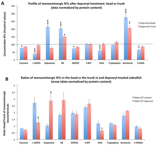 Distribution of monoaminergic neurochemicals between the head and trunk of zebrafish larvae exposed to 5 µM deprenyl for 24 h. (A) Concentration of monoaminergic neurochemicals in the head and trunk of larvae exposed to deprenyl, expressed as a percentage of the control values; (B) Ratio of head/trunk for the ten selected monoaminergic neurochemicals in control and deprenyl-treated zebrafish larvae. Data was normalized by protein content. Student’s t-test (n = 8 pools); * p < 0.05, ** p < 0.01, *** p < 0.001; Data from 2 independent experiments.