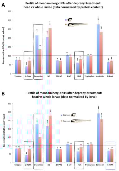 Profile of monoaminergic neurochemicals after deprenyl treatment: head vs. whole body. Concentrations are presented as percentage of the control values. (A) Data normalized by protein content; (B) Data normalized by larva. Student’s t-test (n = 8 pools); ns: non-significant, * p < 0.05, ** p < 0.01, *** p < 0.001; Data from 2 independent experiments.