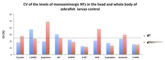 Sectioning heads of zebrafish larvae is an easy and fast process, but also a potential source of variability of the data, as it is difficult to section all the heads exactly at the same level. Therefore, the coefficients of variation (CV) of the neurotransmitter data obtained from heads and the whole body were compared. As Figure 4 shows the data variability in the head was lower than that in the whole body for tyrosine, dopamine, HVA, and serotonin. In contrast, data variability was lower in the whole larvae for L-DOPA, NE, DOPAC, and tryptophan. Finally, variability for 3-MT and 5-HIAA was very similar in heads and the whole body. Only two of the ten neurochemicals analyzed (L-DOPA and NE) exhibited a CV above 25% in the head, whereas four of them (tyrosine, dopamine, HVA, and serotonin) exhibited a CV above 25% in the whole-body samples.