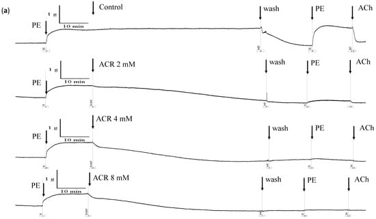 How ACR causes vasorelaxation and neuromuscular toxicity remains unclear. This study investigated the mechanisms underlying ACR-induced vasorelaxation and neuromuscular toxicity by using a rat aortic ring model and a mouse phrenic nerve–diaphragm model, respectively. We followed the ARRIVE guidelines for reporting on animal studies [,,]. In this study, the isolated rat aortic ring model was used due to its relevance to ACR related to cardiovascular toxicity, and the phrenic nerve–diaphragm model was used due to its relevance to ACR-induced muscle stretching (paralysis) research. The primary advantage of these technologies is that they use living tissue that functions as a whole tissue, with a physiological outcome (contraction or relaxation) that is relevant to the body. It involves a series of steps: drug–receptor interaction, signal transduction, second messenger generation, change in smooth muscle excitability, and change in tissue function. Although other techniques allow the study of each of these steps (e.g., radioligand binding for drug affinity and measurement of second messengers), the isolated tissue bath technique permits the integration of all these steps. Another advantage is that retaining tissue function facilitates the calculation of critical pharmacological variables that are more meaningful in a tissue versus a cellular setting; this is closer to how the drugs work in the body as a whole [].