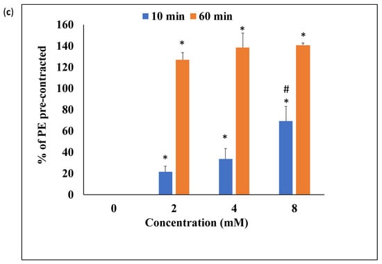 When the endothelium-intact or -denuded groups were treated with ACR (0, 2, 4, and 8 mM), the contractile tension induced by PE decreased in a concentration-dependent manner (Figure 3a,b). By contrast, the contractile tension did not decrease with time in the control group. After 10 min of treatment with ACR at concentrations of 0, 2, 4, and 8 mM, the contractile tension decreased by 0%, 21.7% ± 5.1%, 33.6% ± 9.8%, and 69.1% ± 14.0%, respectively (Figure 3c), in the endothelium-intact group and 0%, 14.6% ± 5.1%, 28.1% ± 7.2%, and 44.2% ± 8.7%, respectively (Figure 3d), in the endothelium-denuded group. The EC50 values of ACR-induced relaxations in the endothelium-intact and -denuded aortic rings were 5.75 and 8.53 mM, respectively. After 60 min of treatment with ACR at concentrations of 0, 2, 4, and 8 mM, the contractile tension decreased by 0%, 127.0% ± 6.7%, 138.5% ± 13.5%, and 140.8% ± 1.9%, respectively (Figure 3c), in the endothelium-intact group and 0%, 132.9% ± 5.8%, 141.8% ± 14.8%, and 121.6% ± 9.7%, respectively (Figure 3d), in the endothelium-denuded group. After observing the endothelium-intact or -denuded group for 60 min, the aortic ring was flushed with a physiological buffer solution without ACR. After recontraction with PE, the contractile tension of the aortic ring in the 0-, 2-, 4-, and 8-mM treatment groups was 103.9% ± 23.9%, 11.4% ± 6.3%, 8.4% ± 9.3%, and 1.3% ± 2.9%, respectively (intact group), and 89.5% ± 22.5%, 14.4% ± 4.0%, 6.3% ± 2.6%, and 0.8% ± 0.6%, respectively (denuded group). Thus, ACR-induced vasorelaxation occurred in a concentration-dependent manner in both the endothelium-intact and -denuded aortic ring groups.