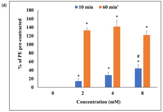 Effects of acrylamide (ACR) on endothelium-intact (a,c) and endothelium-denuded (b,d) aortic rings. Aortic rings were precontracted using phenylephrine (PE) (2 μM) for 15 min, and the control (ACR 2, 4, and 8 mM) was added to the aortic rings. The samples were individually recorded for 60 min. (*: significant difference vs. control, p < 0.05; #: significant difference between ACR 4 mM and ACR 8 mM).