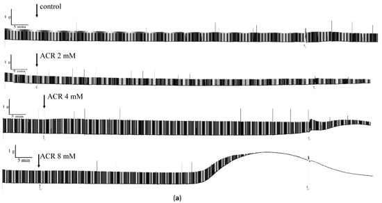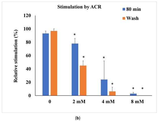 The muscle contraction rates of groups after treatment with 0, 2, 4, and 8 mM ACR for 80 min were 0%, 0%, 42.5% ± 26.5%, and 123.0% ± 37.7%, respectively (Figure 4c), indicating a dose-dependent increase (p < 0.05). After the samples were rinsed with a physiological buffer solution without ACR, the muscle contraction rates were 0%, 0%, 47.4% ± 9.5%, and 50.8% ± 5.8% in the 0-, 2-, 4-, and 8-mM treatment groups, respectively, indicating a dose-dependent increase (p < 0.05) (Figure 4c).