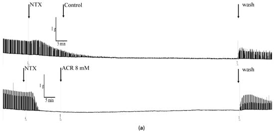 We examined the effects of NTX on ACR-induced muscle contraction. The 80-min baseline values were compared with the ACR treatment baseline values. The baseline change in the control group was −19.4% ± 4.2% and in the experimental group was −4.3% ± 6.7% (Table 3; p < 0.05). After rinsing with fresh physiological buffer solution, no significant difference in baseline changes was observed (Table 3), indicating that NTX does not cause a change in the baseline.