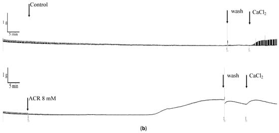 Ca2+ is an essential factor in smooth muscle contraction and relaxation. We examined the effect of ACR when extracellular CaCl2 (5 mM) was added. At 10 min after the addition of Ca2+ ions, an increase in contraction was observed in the experimental group by 231.5% ± 60.4% and in the control group (only ACR treatment) by 170.0% ± 38.2% (Table 2; p > 0.05). At 60 min, the treatment group exhibited a relaxation of −136.1% ± 49.7%, whereas the control group exhibited a contraction of 226.9% ± 53.3% (Table 2; p < 0.05). Thus, the experimental group was affected by ACR-induced vasorelaxation.