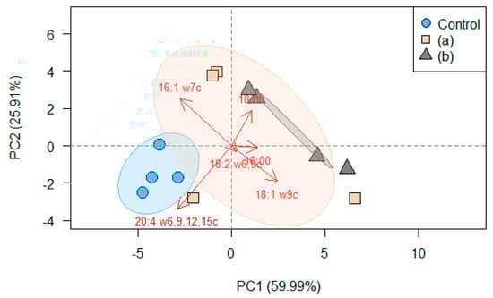 Biplot of principal component analysis (PCA) based on the fatty acid profiles (%) of Allonychiurus kimi (Lee) adults after 28 d of exposure to glyphosate at concentrations of 0.0 (control), 37.1 (a), and 370.5 (b) mg kg−1 with a 95% confidence ellipse. The arrows indicate the direction and magnitude at which each variable contributes to the variation between the treatments.