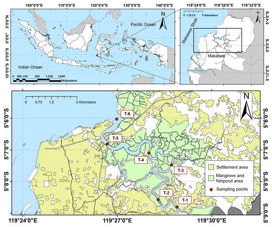 The study was conducted in the section of the Tallo River that crosses Makassar City, Indonesia. Samples were taken in March and August 2019 to represent the wet and dry seasons, respectively. Six sampling points were distributed purposively based on their position from the upstream to the downstream part of the river section. Sampling points 1 and 2 were located on the upstream part of the river, where there is a thick Nypa fruticans green belt on the riverbank in this river segment. The mid-stream section was represented by sampling points 3 and 4, which are surrounded by a mangrove ecosystem and fisheries activities, such as a fish and shrimp pond. Between points 3 and 4, a flow of water enters from the Makassar industrial area. The downstream segment was represented by sampling points 5 and 6, which are surrounded by Makassar City’s slum district. There is also a water flow that enters the Tallo river at point 5, originating from the Makassar urban area. Land use/cover area [] and sampling points on Tallo River are described in Figure 1.