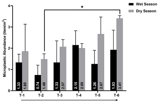 Microplastic abundance on the surface water of Tallo River. The arrows below the graph indicate the position of sampling points from the upstream to the downstream part of the river. The error bar indicates standard deviation (n = 3). The asterisk indicates the significant difference between sites based on a one-way ANOVA (p < 0.05).