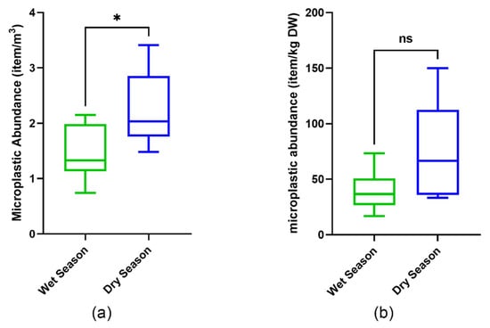 Boxplot diagram of microplastic abundance in water (a) and sediment (b) during the wet and dry seasons in Tallo River. The asterisk indicates the significant difference between the sites based on a t-test (p < 0.05). ns indicate no statistical difference between the sites based on a t-test (p > 0.05) explanation.