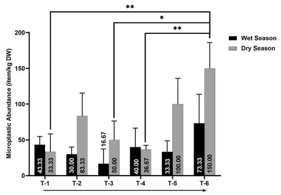 Microplastic abundance in sediment from Tallo River. The arrows below the graph indicate the position of every site from the upstream to the downstream part of the river. The error bar indicates standard deviation (n = 3). The asterisk (*) indicates the significant difference between the sites based on a one-way ANOVA (p < 0.05). The double asterisks (**) indicate the higher significant difference between the sites (p < 0.01).