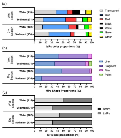 The proportions of the MPs’ colors (a), shapes (b) and sizes (c) in the water and sediment samples from Tallo River. SMPs, small microplastics (<1 mm); LMPs, large microplastics (1–5 mm).