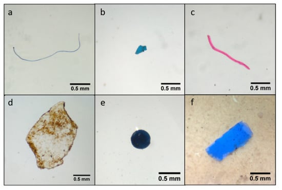 Representative of MPs found in the samples. Blue and red line (a,c), blue fragment (b), transparent fragment (d), blue pellet (e), and blue film (f) MPs.