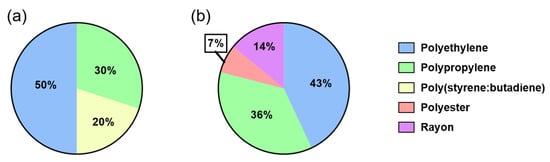 A total of five polymers were identified in the study site (Figure 7). The most predominant polymers found in the water and sediment samples were polyethylene (43–50%) and polypropylene (30–36%). Poly(styrene:butadiene) was only found in the water samples (20%). Synthetic rayon and polyester were only found in the sediment samples (14% and 7%, respectively). Poly(styrene:butadiene) and polyethylene were mainly found in the shape of fragments, while polypropylene, rayon and polyester were found in the form of lines. As the highest-produced polymer globally, polypropylene and polyethylene are more available to reach the aquatic environment []. This condition means that polyethylene and polypropylene are commonly found in freshwater environments []. Poly(styrene:butadiene) is mainly used for anti-abrasion surfaces, such as in car tires and shoe soles, while rayon and polyester are commonly used as textile material [,,,]. A single wash of about 6 kg of polyester clothes can release nearly 500,000 polyester fibers in its waste effluent, leading to a higher polyester line in the environment []. The low density of polystyrene-butadiene (0.94 g/cm3) means this polymer commonly accumulates in surface water. In contrast, rayon and polyester have a higher density than 1.35 g/cm3, higher than the water density []. This condition means rayon and polyester tend to sink in the environment and end up in the sediment compartment.