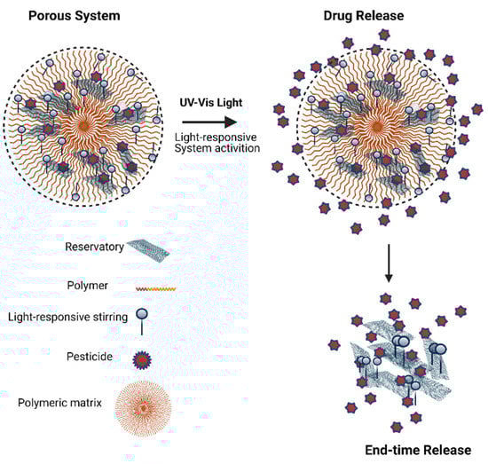 A stimuli light-responsive controlled release (Figure 1) has been used as a delivery system in various agro-livestock application areas with environment-friendly property in the field and greenhouse cultivation. Poly(ethylene oxide-b-methacrylic acid) (PEO-PMAA), a light-responsive co-polymer, was obtained with light-sensitive groups; after self-assembly and encapsulation of pesticide, the controlled release has achieved, and an extensive residual activity of the formulation was observed [].