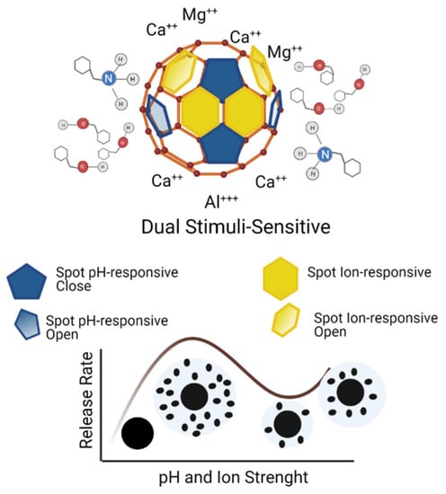 A dual responsive system for pH and ion strength (Figure 2) is an engineering effort focusing on innovative material to reduce the amount of pesticide used in the crop, innovative modified-release in a complex environment, decreased pesticide leaching and decomposition, and the minimal adverse impact ecosystem []. An innovative release system for environmental stimuli can prevent the premature complexation of agrochemicals, inhibit the sulfidation reaction, and exhibit extended pest control capabilities [,].