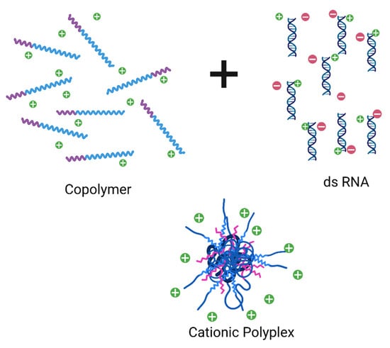 Schematic illustration of self-assembly reaction between cationic copolymer and dsRNA (double-stranded RNA) to prepare a cationic polyplex system as pesticide reservoir pH-sensitive.
