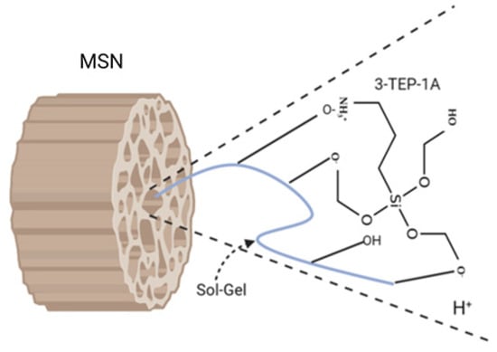 Schematic illustration of the sol-gel interaction pH-responsive and anchoring the 3-(triethoxysilyl) propane-1-Amine (3-TEP-1A) molecule on the inner pore surface of the modified mesoporous silica nanoparticles (MSN).