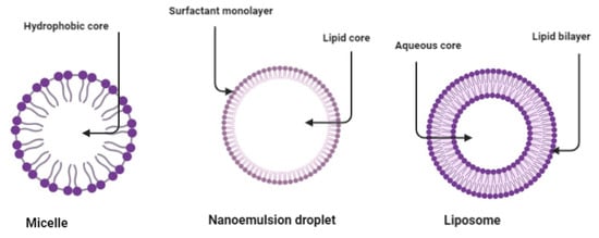 Structural form and composition of the micelle, nanoemulsion droplet and liposome formulations. The tail of the surfactant forms the hydrophobic core of the micelle. Nanoemulsion water-in-oil stabilized by surfactant surround lipid core. Liposome lipid bilayer and aqueous core.