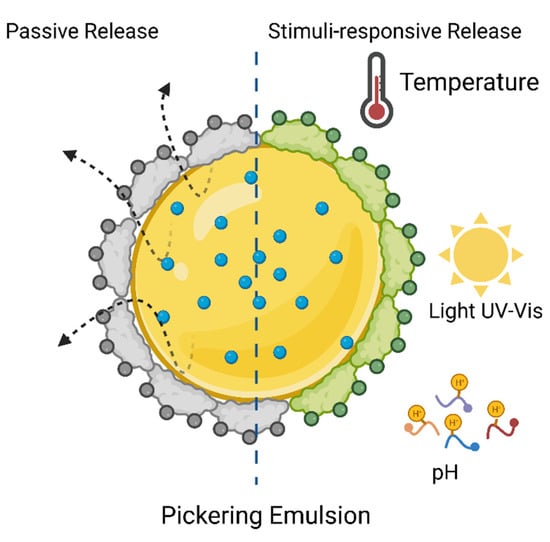 Structural form of Pickering emulsion and release mechanisms passive and stimuli-responsive.