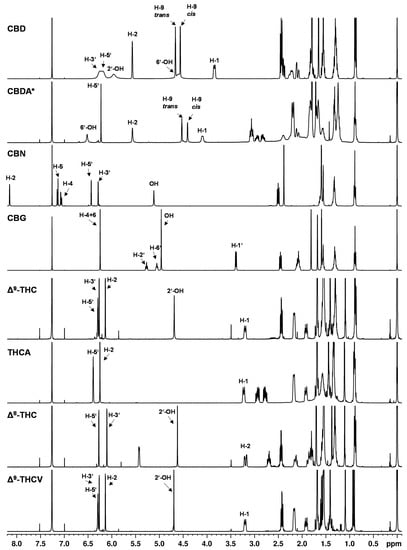 1H NMR spectra of cannabinoids CBD, CBDA, CBN, CBG, ∆9-THC, THCA, ∆8-THC, THCV dissolved in CDCl3. * Cannabinoid stabilized as N,N-dicyclohexylammonium salt.