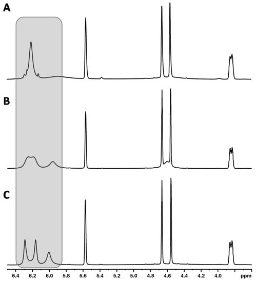 1H NMR spectra of CBD recorded at (A) 315 K, (B) 300 K, (C) 285 K.