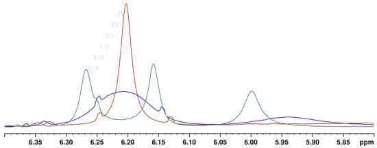 1H NMR spectra of a CBD + ∆9-THC standard in hemp seed oil in the aromatic proton region at 280 K (green), 300 K (blue) and 320 K (red). Solvent: CDCl3.