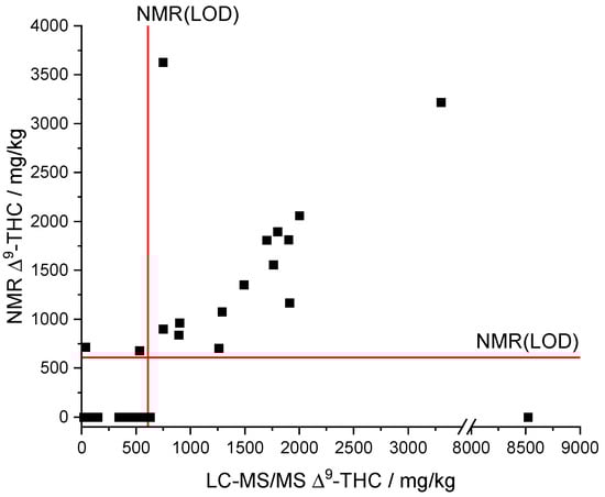 The automatic qNMR method only output values above the LOD of the NMR (608 mg/kg, see Figure 7). The LC-MS/MS results provided a ∆9-THC content below the LOD of the NMR for a total of 23 samples. Moreover, concentrations below the LOD of the NMR cannot be qualitative determined by the qNMR method. The data of the samples whose LC-MS/MS results are above the NMR(LOD) indicate a linear correlation between both methods (Figure 7). Only sample 16 (NMR: ∆9-THC n.n.; LC-MS/MS: 8520 mg/kg ∆9-THC) was significantly underdetermined but sample 25 (NMR: 3629 mg/kg ∆9-THC; LC-MS/MS: 748 mg/kg ∆9-THC; recovery = 485%) was overdetermined.