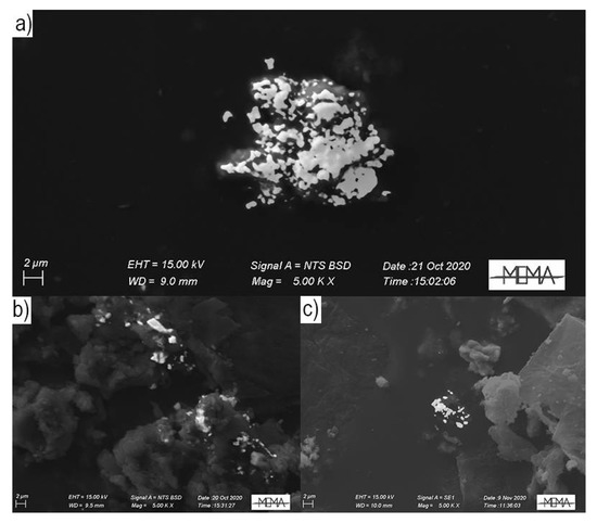 Mix of secondary electron (SE) and backscattered electron (BSE) images of the clusters of Hg-particles found in (a) W-OD, (b) W-AD and (c) W-ND, respectively.