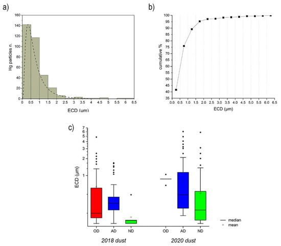 (a) Frequency distribution and (b) cumulative percentage of equivalent circular diameter (ECD) of all the Hg-particles in both the 2018 and 2020 sampling campaigns; (c) particle size ranges divided by year and dust type.
