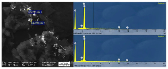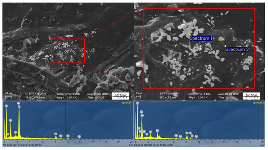 Interestingly, the results of the chemical characterization (30-s live-time SEM-EDS analysis) of the Hg particles (n = 54) only sporadically revealed the presence of Cl, the original anion to which Hg was bound when employed on plant samples. In only one particle of the 2020 W-OD sample Hg was indeed clearly associated with Cl, and hence ascribable to a Hg chloride. On the contrary, the element commonly found in the Hg particles was S (Figure 4), often displaying a Hg to S molar ratio of 1:1 (Figure 5). In these particles, O was notably absent. When O was present in low concentrations (~20% total weight), it probably came from the X-ray generation volume surrounding the Hg particles, as can be seen in Spectrum 2 of Figure 6. Similarly, we can explain the association of Cu to Hg in several sites of the 2020 W-AD sample as a volume halo effect (Figure 6).