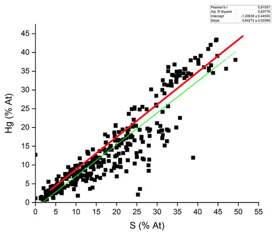 Atomic ratio (% At) between Hg and S in all the Hg particles found in both the sampling years in the Webb Hall. Green line and the coefficients refer to the regression analysis between the percentages of the two elements, while red line refer to the hypothetical 1:1 (atomic) ratio between these elements.