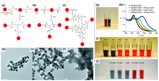 Representation of AuNP-based arsenic detection. (a) DTT-modified AuNPs; (b) Cys-modified AuNPs; (c) GSH-modified AuNPs; (d) TEM image showing GSH/DTT/Cys-modified AuNPs before the addition of arsenic (III); (e) TEM image demonstrating aggregation of GSH/DTT/Cys-modified AuNPs after addition of 80 ppb arsenic (III); (f) TEM image after the addition of 250 ppt arsenic (III); (g) photograph showing colorimetric change of GSH/DTT/Cys-modified gold nanoparticles upon addition of 800 ppb arsenic (III); (h) absorption profiles of modified gold nanoparticles before and after addition of arsenic (III) ions; (i) photograph showing colorimetric changes of GSH/DTT/Cys-modified gold nanoparticles in the presence of PDCA upon addition of various metal ions (5 ppb) and (j) different concentrations of arsenic (III) [61]. Copyright 2009, reproduced with permission from WILEY-VCH Verlag GmbH & Co. KGaA, Weinheim, Germany.