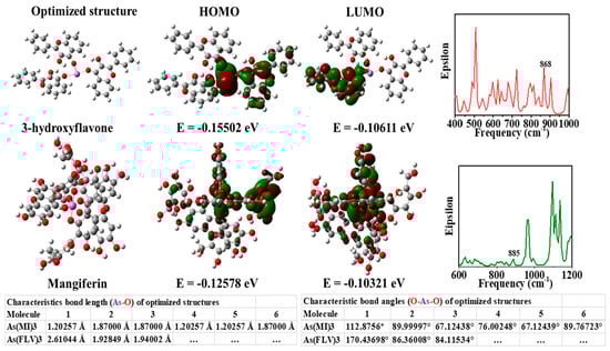 Images of theoretically optimized arsenic complexes with FLV (3-hydroxy flavone) and mangiferin (MI), highest occupied molecular orbital (HOMO), lowest unoccupied molecular orbital (LUMO), and a theoretical infrared (IR) spectrum [64]. Copyright 2020, reproduced with permission from Elsevier B.V., Amsterdam, The Netherlands.