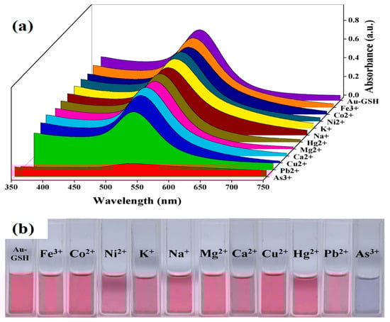(a) Absorption spectra of GSH-AuNPs in the presence of different metallic ions and (b) the digital photograph of color changes of GSH-AuNPs in the presence of different metallic ions at a concentration of 10 ppb and while arsenic (III) was 1 ppb [65]. Copyright 2020, reproduced with permission from Elsevier B.V., Amsterdam, The Netherlands.