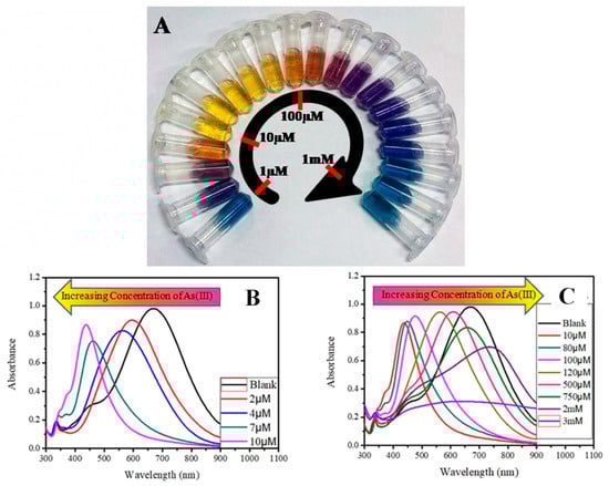 (A) Concentration-dependent color-coded sensing of arsenic (III) between the concentration range of 10−6 to 10−3 M, (B) tuning of SPR as a result of morphological change of AgNPr at different concentrations of arsenic (III) between 10−6 and 10−3 M where (B) shows the variation of plasmon band at different lower concentrations of arsenic (III) in the range of 0.0–10.0 μM (0.0 μM (blank): black trace (λmax = 704 nm), 1.0–2.0 μM: blue trace, 2.0–4.0 μM: orange trace, 5.0–7.0 μM: red-violet trace, 8.0–10.0 μM: blue-violet trace) and (C) at different higher concentrations of arsenic (III). The plasmon band, and hence the color of the nanomaterials, changes in a distinct manner, where a specific color remains unchanged in a broader range of growing concentrations such as: 10.0–80.0 μM: yellow, 90.0–100.0 μM: orange, 110.0–200.0 μM: dark red, 250.0–500.0 μM: purple, 750.0 μM to 2 mM: different shades of blue, 3–10 mM: faded blue, and above 10 mM the color becomes faint blue to grey or almost colorless [69]. Copyright 2019, reproduced with permission from American Chemical Society, Washington, DC, USA.