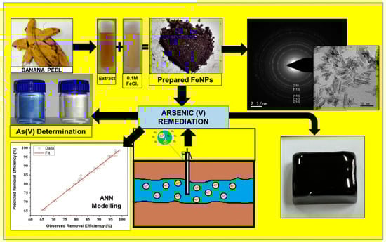 Globally, intake of arsenic (III) and arsenic (V) ions via food and drinking water has dramatically increased, as per several recent reports [1,2,3,4,5,6,7,8]. Approximately 200 million people worldwide are affected by arsenic toxicity [9]. According to the World Health Organization (WHO), arsenic in drinking water at a concentration of >10 ppb is highly unsafe to community health [10,11]. Arsenic comes to the groundwater surface via magmatism and periodic erosion [12,13,14]. In addition, several human activities are also responsible for raising the concentration of arsenic levels in groundwater. Industries that discharge effluents with arsenic into the soil or natural water resources include those involved in agrochemicals, pesticides, wood processes, and preservatives [15,16,17].