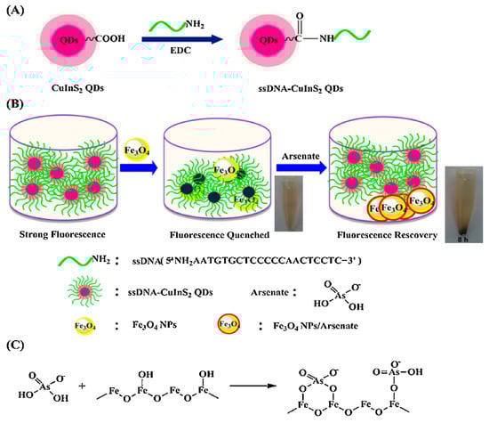 (A) Schematic illustration for the fabrication of ssDNA-CuInS2 QDs. (B) The schematic illustration of sensing arsenate by ssDNA-CuInS2 QDs@Fe3O4 NPs and the arsenate removal photographs by a magnet. (C) Schematic illustration of the mechanism of arsenate adsorption onto Fe3O4 NPs [77]. Copyright 2015, reproduced with permission from Elsevier B.V., Amsterdam, The Netherlands.