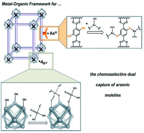 A schematic illustration illustrating how MOFs can be tailored to coordinate anionic arsenic (V) moieties at the node while binding neutral arsenic (III) to the framework [90]. Copyright 2016, reproduced with permission from Royal Society of Chemistry, London, U.K.