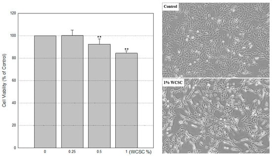 Cells (2 × 104 cells/mL) were stabilized overnight on a 96-well plate and treated with WCSC (0, 0.25, 0.5, or 1%) for 24 h. The MTT solution (Sigma-Aldrich, St. Louis, MO, USA) was added to each well and the cells were incubated for 4 h at 37 °C. Then, formazan crystals were dissolved with dimethyl sulfoxide (Duchefa Biochemie, Haarlem, RV, Nederland), and the absorbance was measured at 540 nm using a multimode microplate reader (BioTek, Winooski, VT, USA).