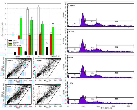 Under a phase-contrast microscope, we found that cell proliferation was reduced by WCSC treatment; however, dead cells were not evident at up to the maximum concentration tested. Thus, we investigated changes in the cell cycle following exposure to WCSC. After 24 h exposure to WCSC (0, 0.25, 0.5, or 1%), the cells were washed once with phosphate-buffered saline and fixed in 70% ethanol overnight at 4 °C. The cells were then incubated with RNase (100 μg/mL) for 1 h at 37 °C, and propidium iodide (50 μg/mL) was added to each sample. Finally, the cells were analyzed using a flow cytometer (FACSAria III, BD Biosciences, Franklin Lakes, NJ, USA).